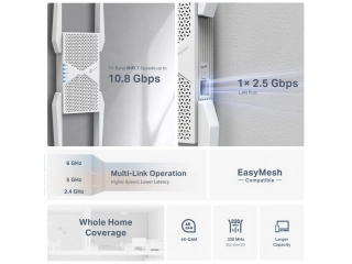 Wi-Fi 7 de nueva generación. Disfruta del Wi-Fi más avanzado hasta la fecha. Con la banda de 6 GHz, canales de 320 MHz, 4K-QAM, MLO y Multi-RU en 6 flujos, tendrás una señal más rápida y estable en toda tu casa.