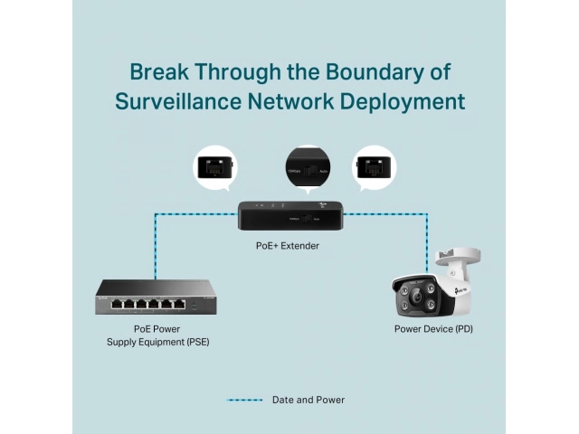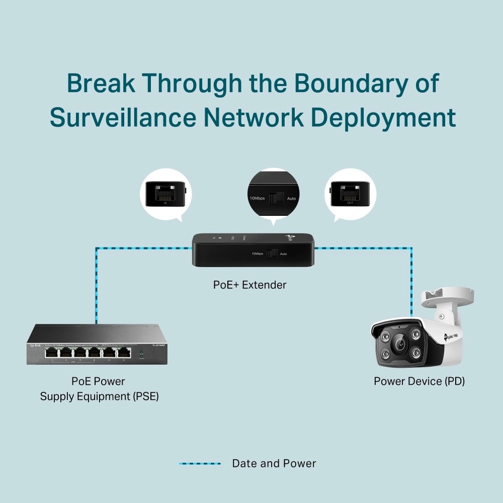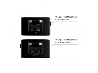 • Extiende una conexión de red PoE/PoE+ 100m – 250m adicionales (Modo 10 Mbps) desde el equipo de fuente de alimentación PoE.