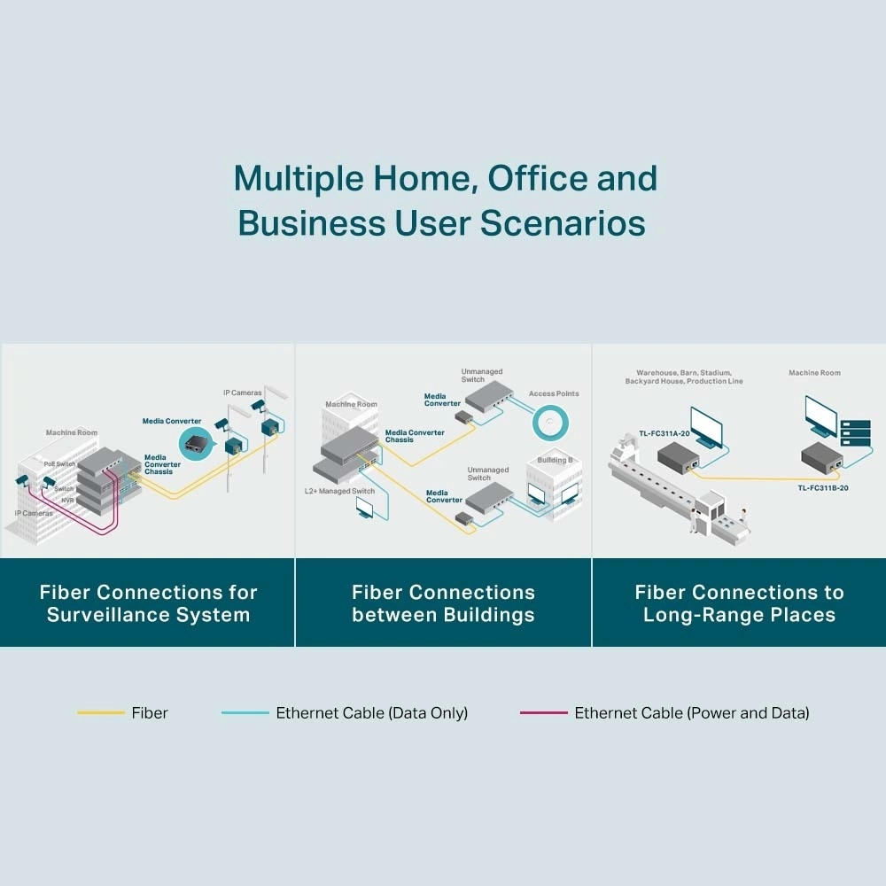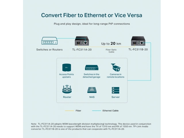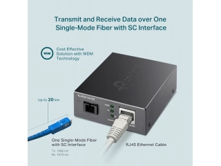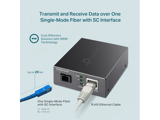 TL-FC311A-20 adopta la tecnología WDM (multiplexación por división de longitud de onda), que ayuda a enviar y recibir datos a una distancia de hasta 20 km con solo una fibra monomodo, lo que ahorra la mitad del costo de implementación del cable para los clientes. TL-FC311A-20 transmite datos a una longitud de onda de 1550 nm y recibe datos a una longitud de onda de 1310 nm en fibra óptica. Por lo tanto, el dispositivo terminal utilizado junto con el TL-FC311A-2 debe enviar datos a una longitud de onda de 1310 nm y recibir datos a una longitud de onda de 1550 nm. TP-Link otro convertidor de medios TL-FC311B-20 es uno de los productos que puede cooperar con TL-FC311A-20.