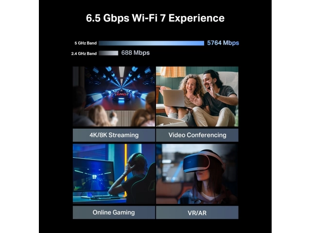 WiFi 7 de doble banda de 6,5 Gbps: Permite que tus dispositivos funcionen a toda velocidad. Disfruta de streaming fluido en 4K/8K, juegos inmersivos de RA/RV y descargas ultrarrápidas.