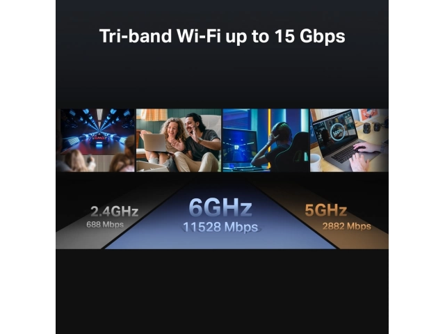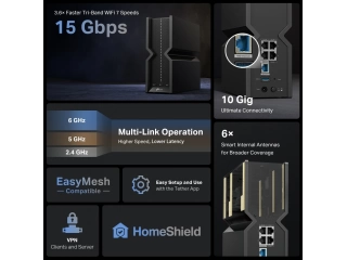 Wi-Fi tribanda ultrarrápido de 15 Gbps:  Wi-Fi 7 aprovecha al máximo la banda de 6 GHz con canales de hasta 320 MHz y velocidades Wi-Fi de 11,5 Gbps. Disfruta de acceso completo a streaming 8K y descargas de alta velocidad.