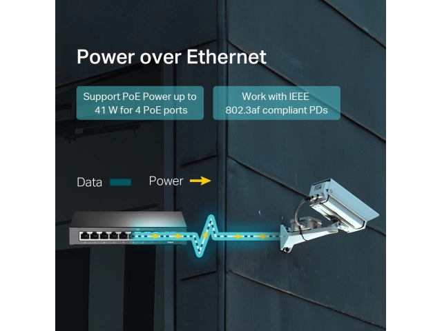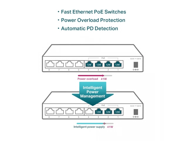 - Admite alimentación PoE de hasta 41 W para todos los puertos PoE.