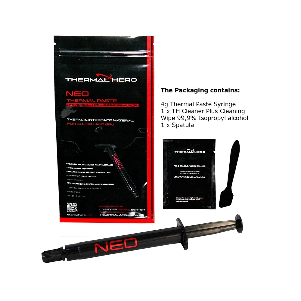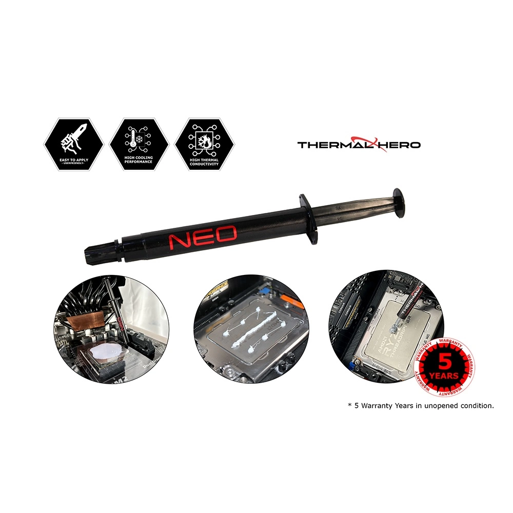 Facilidad de Aplicación: Gracias a su formulación a base de silicona, la pasta térmica Thermal Hero NEO es fácil de aplicar sin problemas de pegajosidad ni excesiva expansión. Esto facilita el proceso de aplicación, garantizando una cobertura uniforme para un rendimiento térmico óptimo.