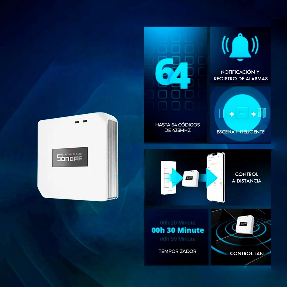• Convierte tu mando a distancia RF de 433 MHz tradicional en inteligente. Añade sensores RF de 433 MHz para crear escenas inteligentes y crear tu sistema de seguridad doméstico.