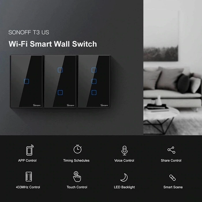 Interruptor, Inteligente, Smart, Pared, Sonoff, T3US1C-TX, WiFi, RF, Táctil, touch, 1 Pulsador, negro