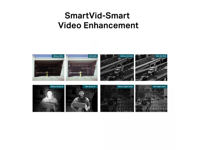 Mejora de video inteligente: Las tecnologías integradas Smart IR, WDR, 3D DNR y Night Vision procesan los videos para mejorar su calidad y facilitar su posterior visualización.