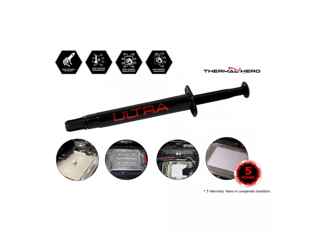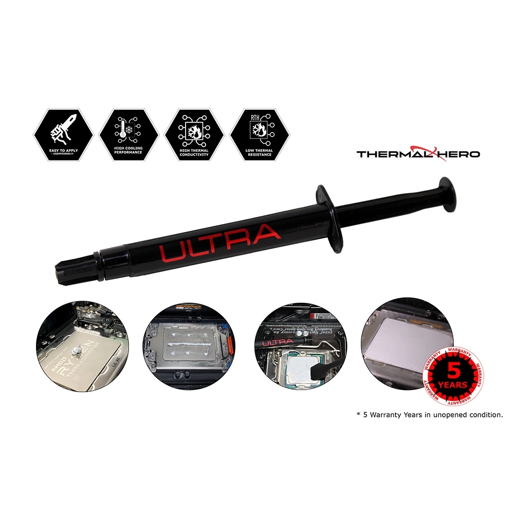 Rendimiento de Enfriamiento Ultra Alto: La pasta térmica Thermal Hero ULTRA destaca por su excepcional capacidad de enfriamiento, gracias a su resistencia térmica muy baja y alta conductividad térmica. Esto la hace ideal para mantener temperaturas óptimas incluso en condiciones de alta demanda de CPU.